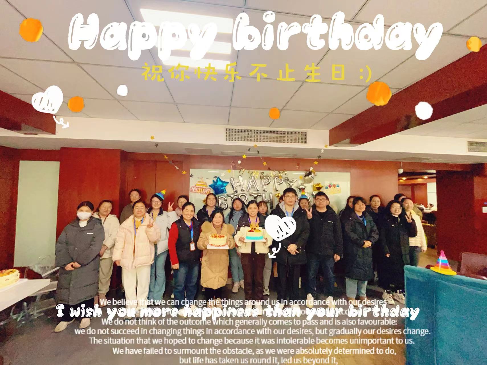 而在這一片歡樂祥和之中,我們又迎來了本月員工的集體生日會。伴隨著生日快樂歌的悠揚旋律,公司為本月壽星們送上了精心準備的生日禮物,并一同切開了象征甜蜜與希望的生日蛋糕。此刻,每一張笑臉都映射出公司對員工個人價值的尊重與認可,那一份代表生日的心意,如同元宵節的燈火一般,照亮了每一位員工的心房。